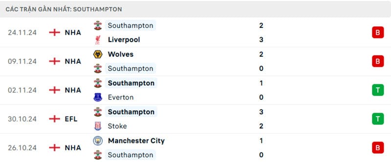 Trận thua gần đây nhất của Southampton là 2-3 trước Liverpool tại St. Mary’s Stadium. Trước đó, họ cũng đã để thua 0-2 trước Wolverhampton Wanderers. Duy chỉ có một chiến thắng 1-0 trước Everton trên sân nhà là điểm sáng hiếm hoi trong một mùa giải đầy khó khăn. Sự thiếu ổn định trong lối chơi và khả năng phòng ngự yếu kém là những vấn đề lớn mà Southampton cần giải quyết.