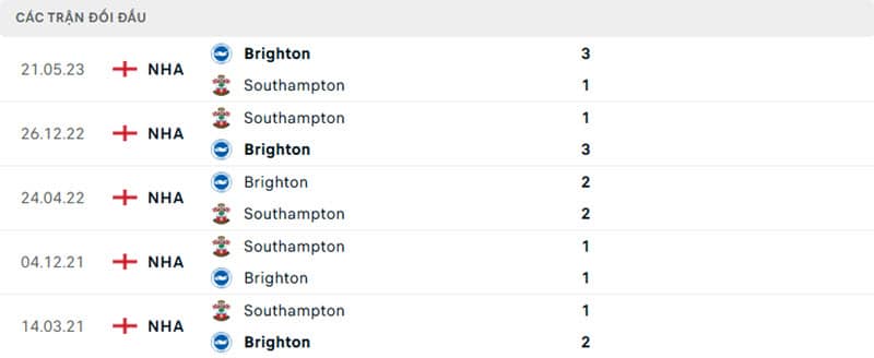 Thành tích đối đầu Brighton vs Southampton