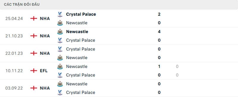 Thành tích đối đầu Crystal Palace vs Newcastle