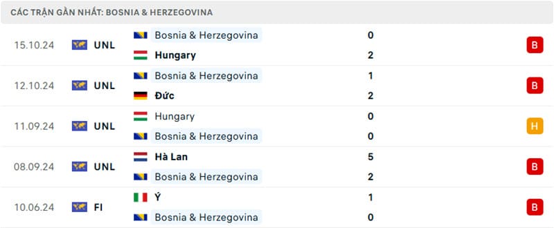 Bosnia đã không thắng trong 10 trận gần nhất trên mọi đấu trường, với 9 trận thua. Họ chỉ có hai chiến thắng trong 16 trận gần đây, đều trước Liechtenstein, cho thấy sự thiếu ổn định và phong độ yếu kém. Đặc biệt, đội bóng này đã thua 8 trong 10 trận đấu xa nhà, điều này làm dấy lên lo ngại về khả năng cạnh tranh của họ trong trận đấu sắp tới.
