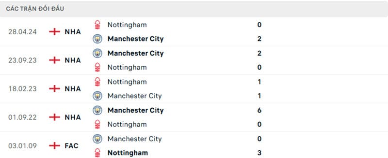 Thành tích đối đầu Man City vs Nottingham